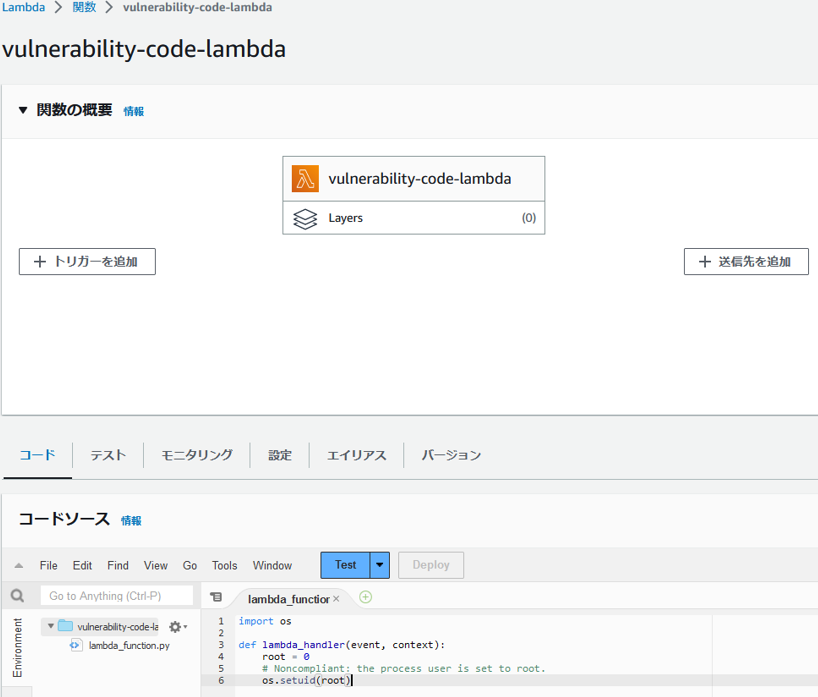 脆弱なコードで含むLambda関数を作成します。