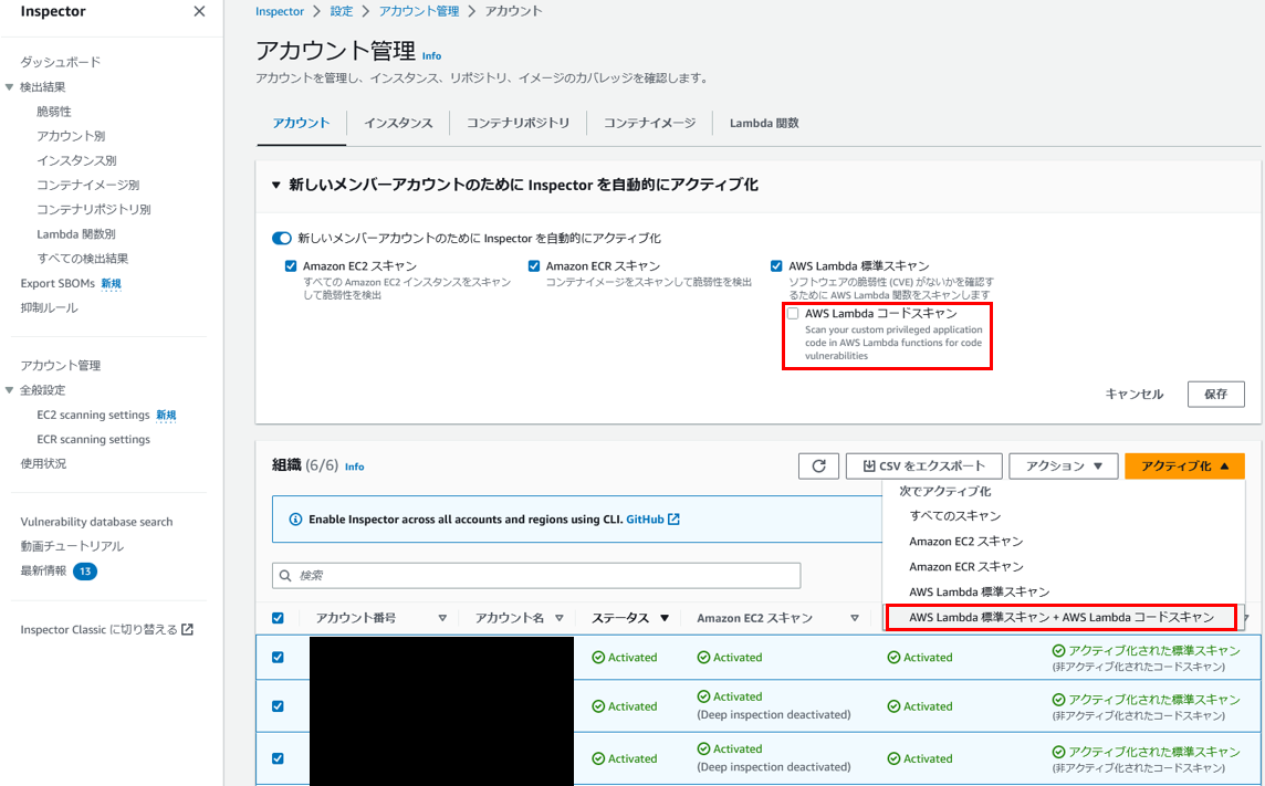「アクティブ化」から「AWS Lambda標準スキャン + AWS Lambdaコードスキャン」を押下します。