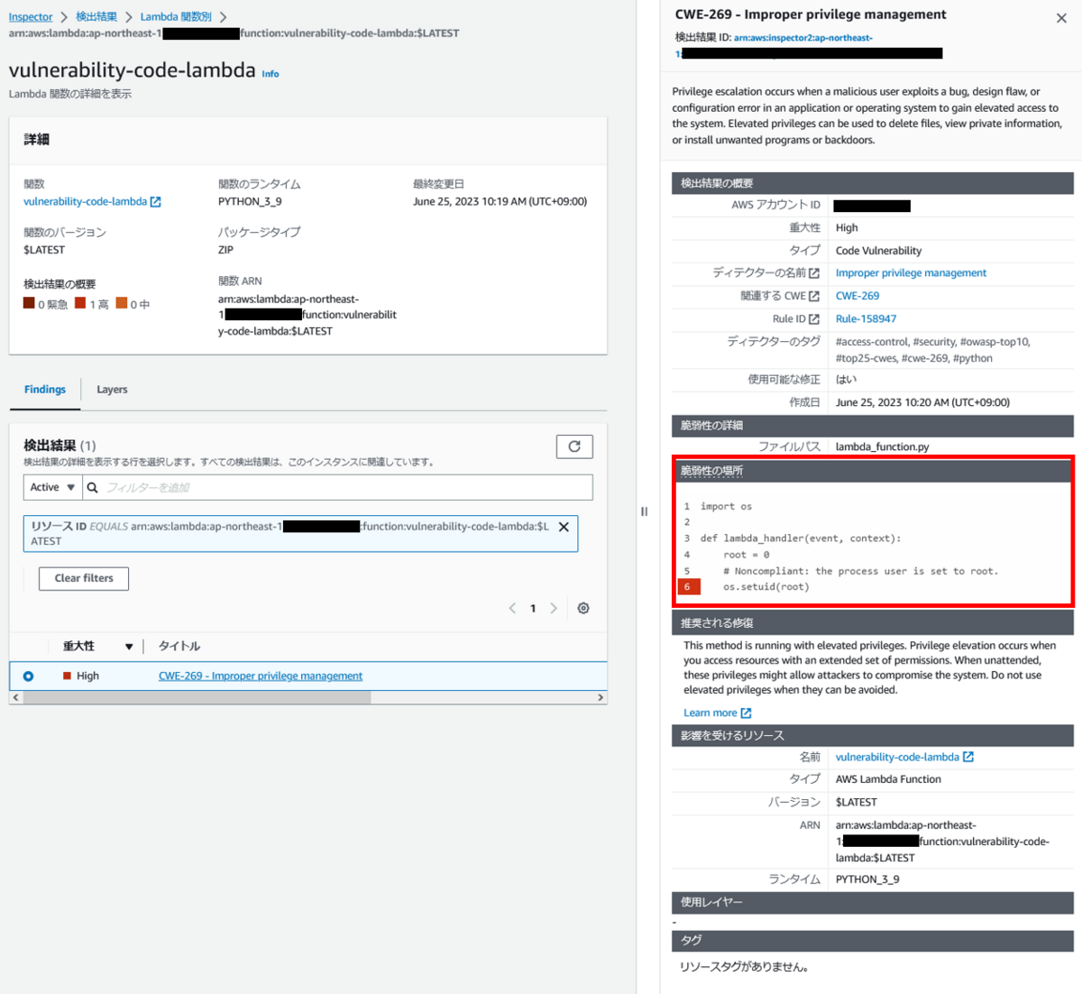 - ユーザが作成したLambda関数内のコードをスキャンして、インジェクションの欠陥、データ漏洩、弱い暗号化、または暗号化の欠落などのコードセキュリティの脆弱性をスキャン