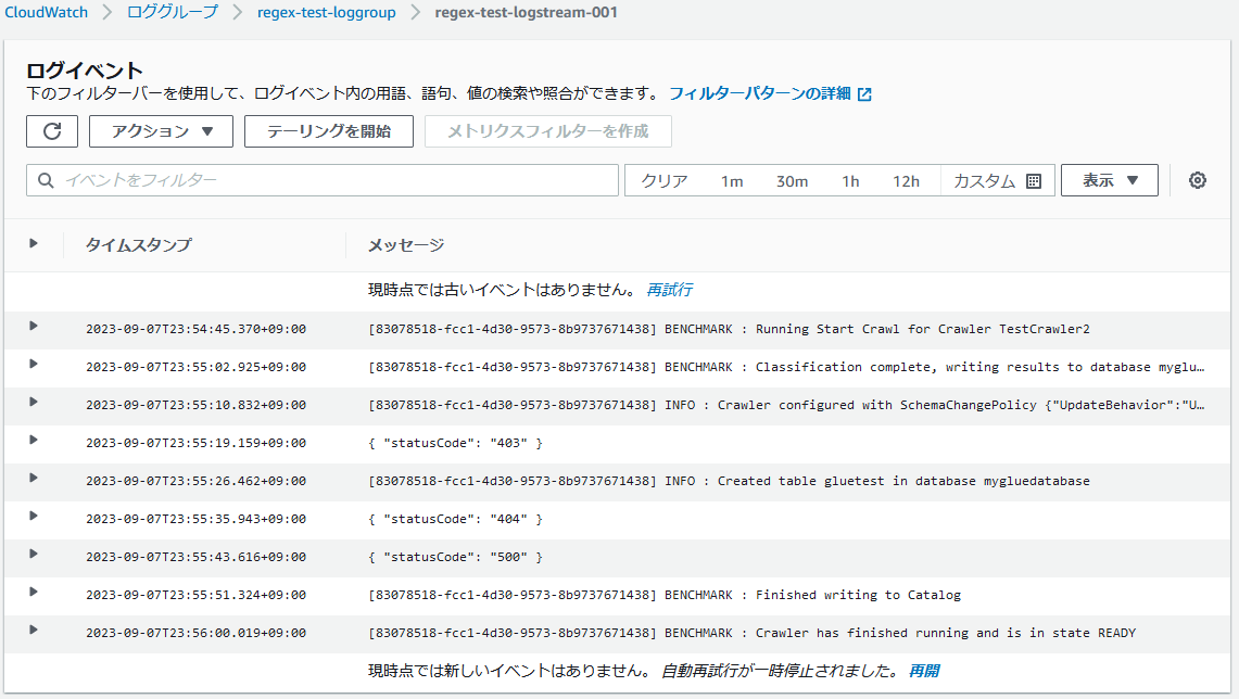 フィルターパターンで正規表現を使うことで、ログ検索ができました。