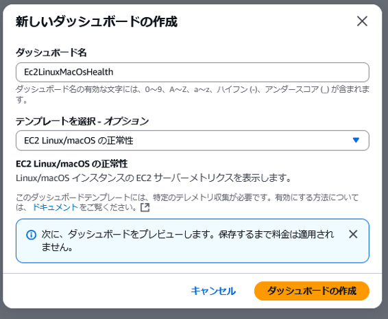CloudWatchで直接ダッシュボードを作成できるようなので、「in CloudWatch」を選択します。
