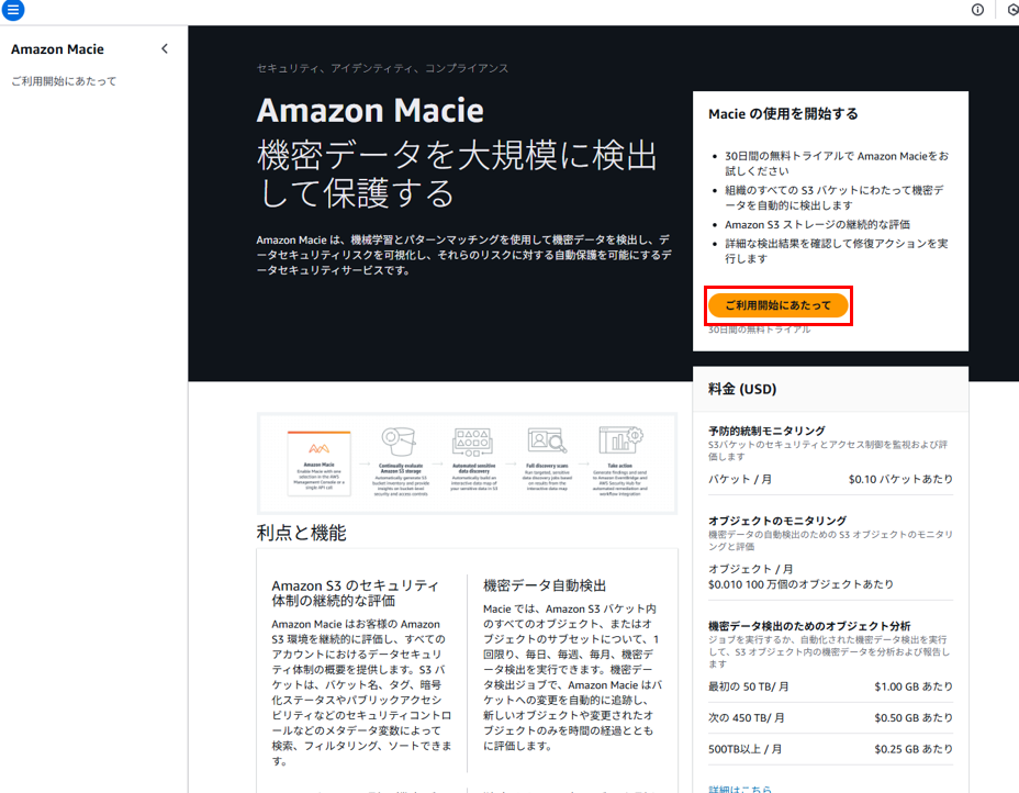 Amazon Macieの画面を表示し、「ご利用開始にあたって」をクリックします。