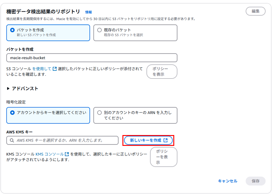 MacieがKMSを利用できるように、キーポリシーに追記する必要があります。