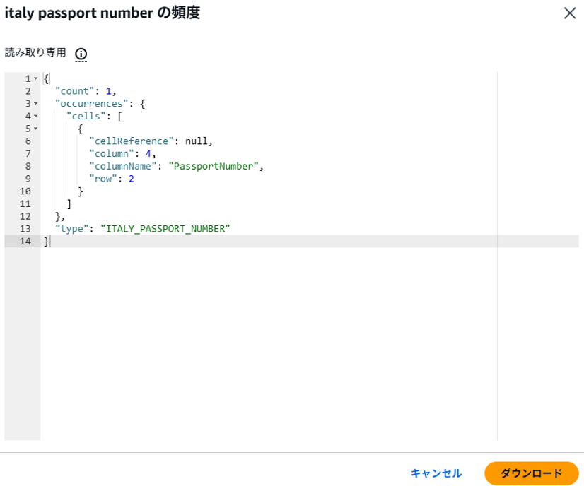 詳細な結果の場所を確認すると、2行目4列目のカラム名がPassportNumberの値が検出されたようです。