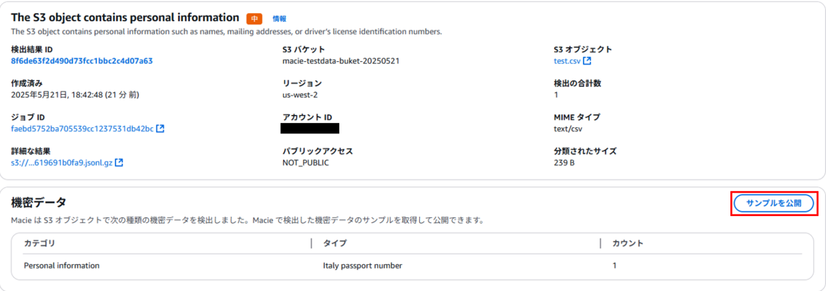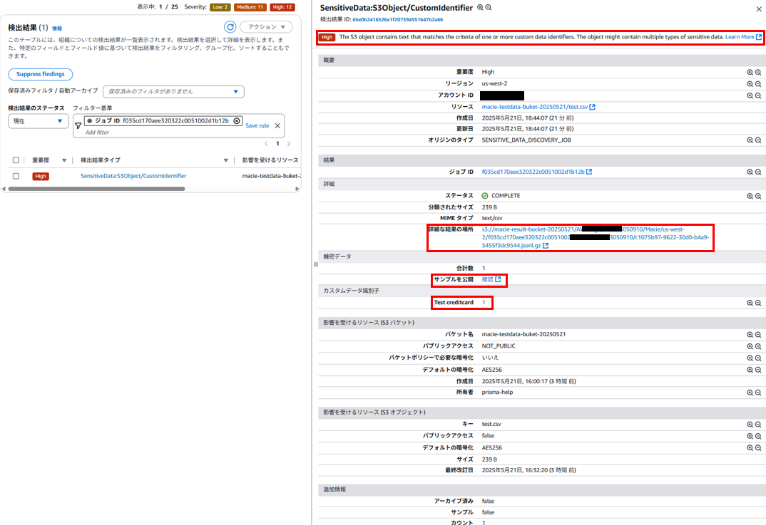 "classificationDetails": { "jobArn": "arn:aws:macie2:us-west-2:xxxxxxxxxxxx:classification-job/5bff942cb02ba5ddb8bb8dd6d4dbf10c", "result": { "status": { "code": "COMPLETE" }, "sizeClassified": "239", "mimeType": "text/csv", "sensitiveData": [], "customDataIdentifiers": { "totalCount": "1", "detections": [ { "arn": "f0001335-946b-4467-ad57-c1f01d7a558d", "name": "test-creditcard", "count": "1", "occurrences": { "lineRanges": [], "pages": [], "records": [], "cells": [ { "row": "2", "column": "3", "columnName": "CreditCardNumber" } ] } } ] } }, "detailedResultsLocation": "s3://macie-result-bucket-20250521/AWSLogs/614213050910/Macie/us-west-2/5bff942cb02ba5ddb8bb8dd6d4dbf10c/xxxxxxxxxxxx/753c9f5f-928c-378e-93bb-2ee1fc452539.jsonl.gz", "jobId": "5bff942cb02ba5ddb8bb8dd6d4dbf10c", "originType": "SENSITIVE_DATA_DISCOVERY_JOB" }