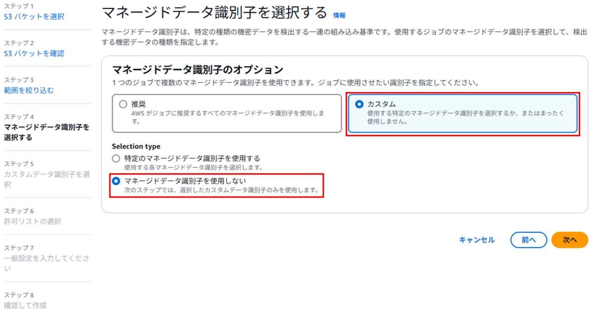 ここでは、「カスタム」と「マネージドデータ識別子を使用しない」を選択します。